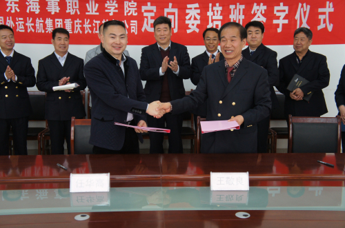 4月13日,中国外运长航集团重庆长江轮船公司与山东海事职业学院定向委培班签字仪式在学院会议室举行,双方将于2016年开始合作组建中国外运长航委培班,联合培养优秀航运人才,开启了学院同中央直属大型国企合作办学的先河。重庆长江轮船公司常务副总经理任华高与学院院长王敬良分别代表双方在协议上签字,潍坊市政府高等教育办公室副主任李广敬、重庆长江轮船公司副总经理何国义、学院副院长李振鹏等出席签字仪式。