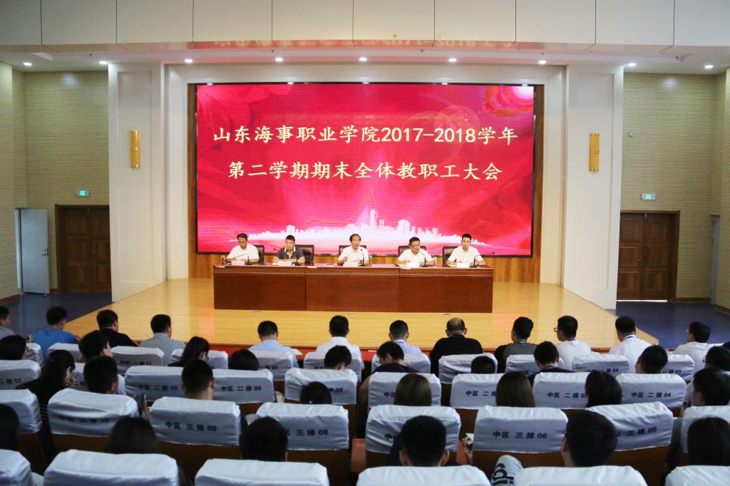 学院党委书记、院长王敬良就学院2017-2018学年第二学期工作,从创新亮点工作、重点工作、存在的问题三个大的方面做了总结。王院长指出,2018年上半年,学院以习近平新时代中国特色社会主义思想为指导,全面贯彻落实党的十九大精神,抓住山东省新旧动能转换历史性机遇,以开展“大学习、大调研、大改进”为抓手,取得优异的办学成绩。在混合所有制办学方面,学院荣获四年一届省职业教育教学成果奖特等奖,教育部、省委办公厅、财政厅、教育厅等上级部门以及省内外20余家院校单位到学院调研、交流混合所有制办学经验,完成潍坊市事业单位登记注册,牵头筹建山东海洋技术大学工作实现新突破。在教育教学品牌建设方面,学院获批打造航海技术、国际邮轮乘务管理两个省级专业品牌,教师参加省级教学技能大赛取得优异成绩。在人才培养方面,学院人才培养质量稳步提升,获得社会高度赞誉。其中,学院组织志愿者服务“上合青岛峰会”获社会赞誉,2015级学生专本套读以及考研取得好成绩,学院获得第十五届山东省大学生机电产品创新设计大赛暨第八届全国大学生机械创新设计大赛山东赛区总决赛一等奖,创新校企合作一体化育人,人才培养质量获企业认可,涌现出诸如张肖涵、于江盼等一批在企业表现突出的学习标兵等等。
