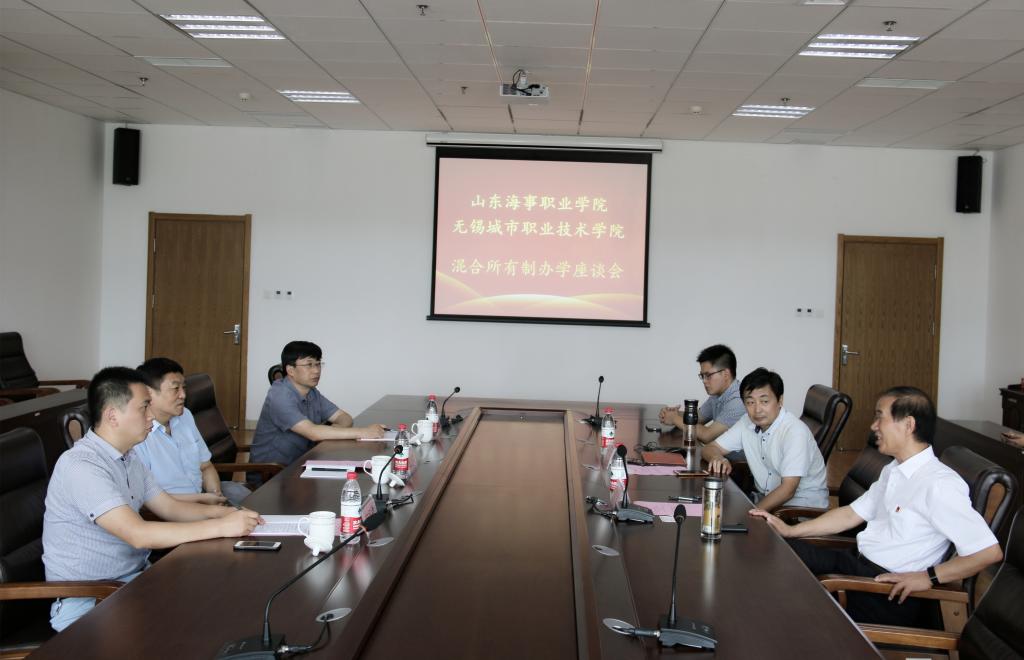 座谈会上,王院长代表学院全体师生欢迎张志祥院长一行的到来,并向张院长一行介绍了学院混合所有制办学情况,牵头筹建山东海洋技术大学情况。张院长向王院长也介绍了无锡城市职业技术学院发展规划情况,并就无锡城市职业技术学院混合所有制办学改制中涉及的资产管理、教职工身份待遇、政府政策支持、政府如何参与混合所有制办学、混合所有制办学体制机制等问题与王院长、郭主任进行了深入交流探讨。